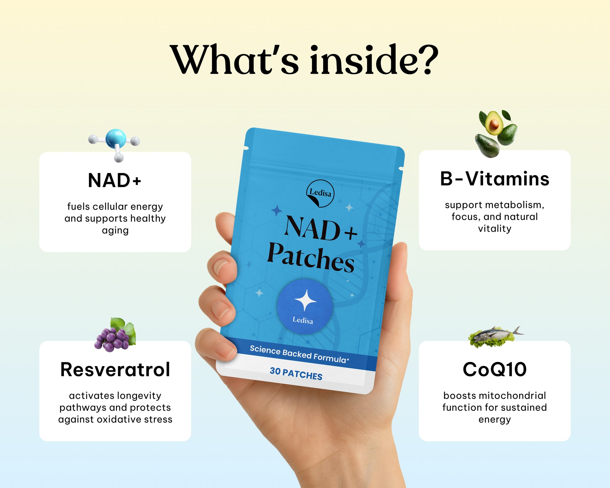 Made with: Acetyl-L-Carnitine Arginate 16.87 mg, CoQ10 16.87 mg, MSM (Methylsulfonylmethane) 16.87 mg, Resveratrol 6mg, Nicotinamide Adenine Dinucleotide (NAD+) 4.22 mg, Vitamin B6 (Pyridoxal-5-Phosphate) 2.53 mg, Vitamin B1 (Thiamine Mononitrate) 0.84 mg, Vitamin B7 (Biotin) 8.44 mcg.